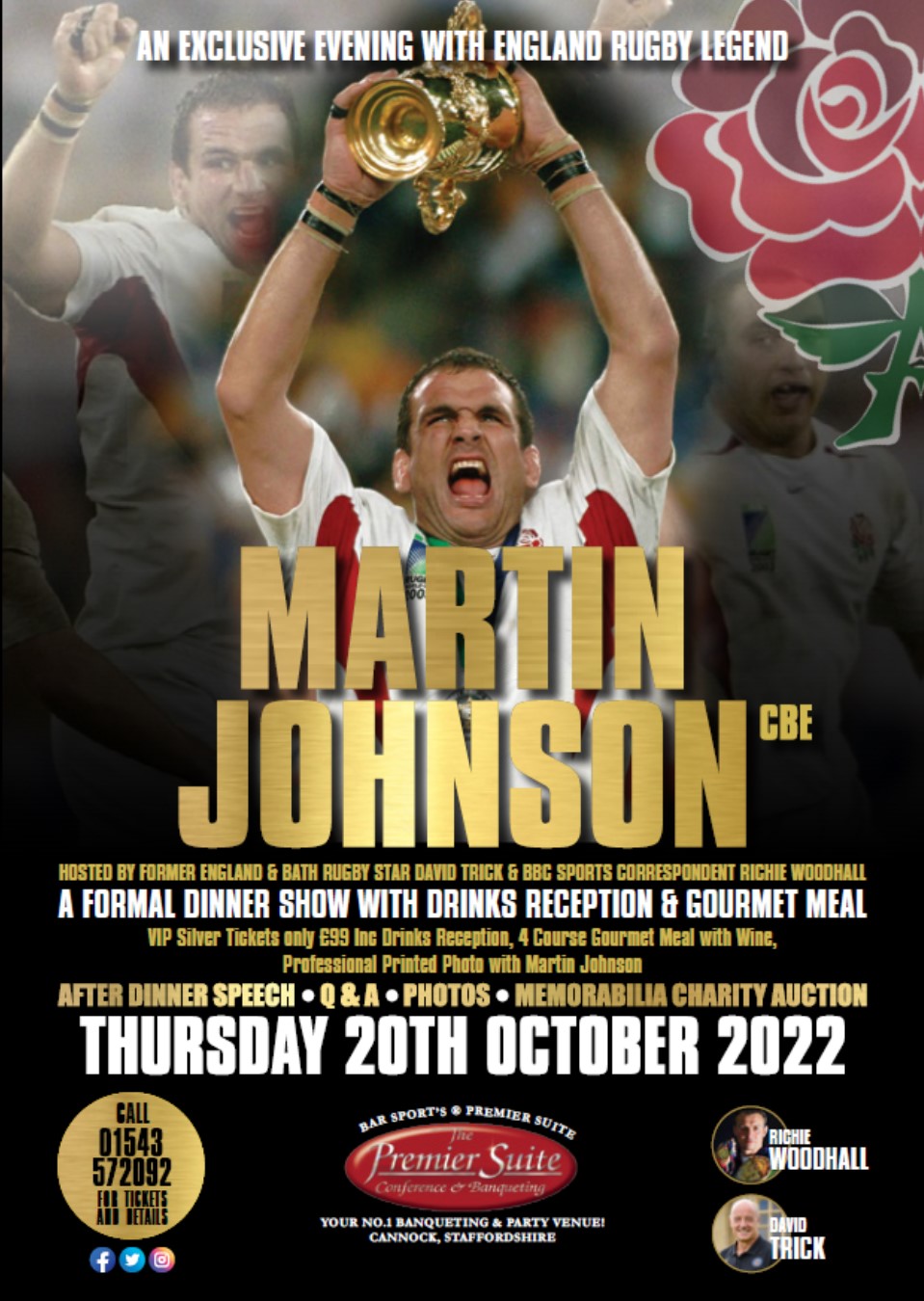 The Evening includes; Welcome Drinks Reception, Gourmet Meal with Wine, Professional Printed Photo with Martin Johnson, After Dinner Speech, Q&A, Rugby Memorabilia & Charity Auction.